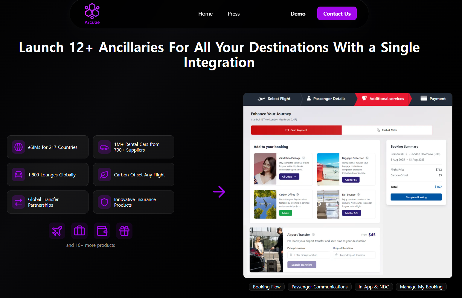 2022년 창업한 영국의 Arcube는 항공사를 위한 부가서비스 aggregation 서비스를 제공하는 스타트업이다. 항공예약 flow, 예약관리페이지, 예약완료/출발전 email등에서 유심, 렌트카, 공항라운지, 보험등 다양한 부가서비스를 판매할 수 있다. 또한 승객이 목적지 도착후, 귀국전에 SMS 메시지를 통한 판매도 가능하게 한다. (Phocuswire 기사보기)