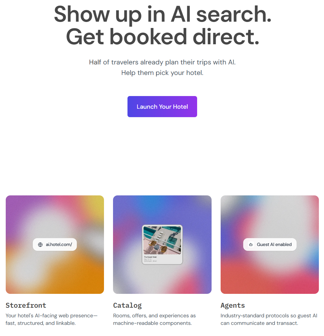 2023년 창업한 미국의 HostAI는 단기숙박업체(STR)들의 direct booking을 위한 솔루션 스타트업이다. SEO/GEO/개인화요금을 제공하는 Front site, 자동화된 이메일마케팅 솔루션, 자동화된 온라인광고 도구로 구성되어 있다. (Phocuswire 기사보기)