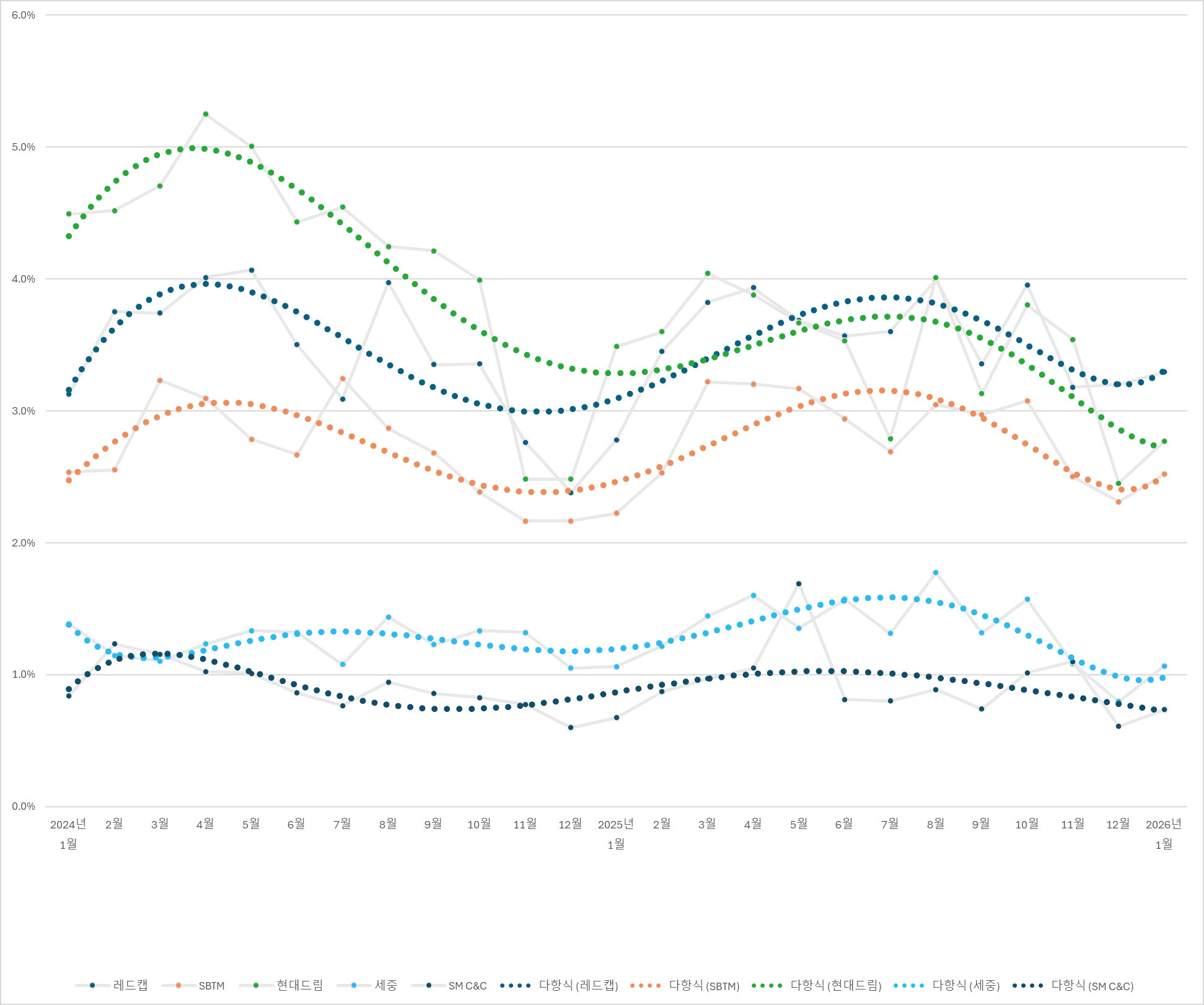 지난 기간 대비 10~20% 높은 수치는 매우 바람직해 보이지만 지난 2025년 추석패키지 여행사의 항공권의 선발권 효과와 같은 일이 여느 때보다 긴 2월 설 명절 패키지에도 적용된 것이 아닐까 하는 생각이 듭니다. 그리고 1월의 이 수치는 최근 2년간 가장 높은 수치로 사실상 상위 기업으로 쏠리는 부익부 빈익빈 효과가 더욱 심화되고 있다고 볼 수도 있습니다. 분류별 MS 분석을 통해 내용을 둘러보시죠.