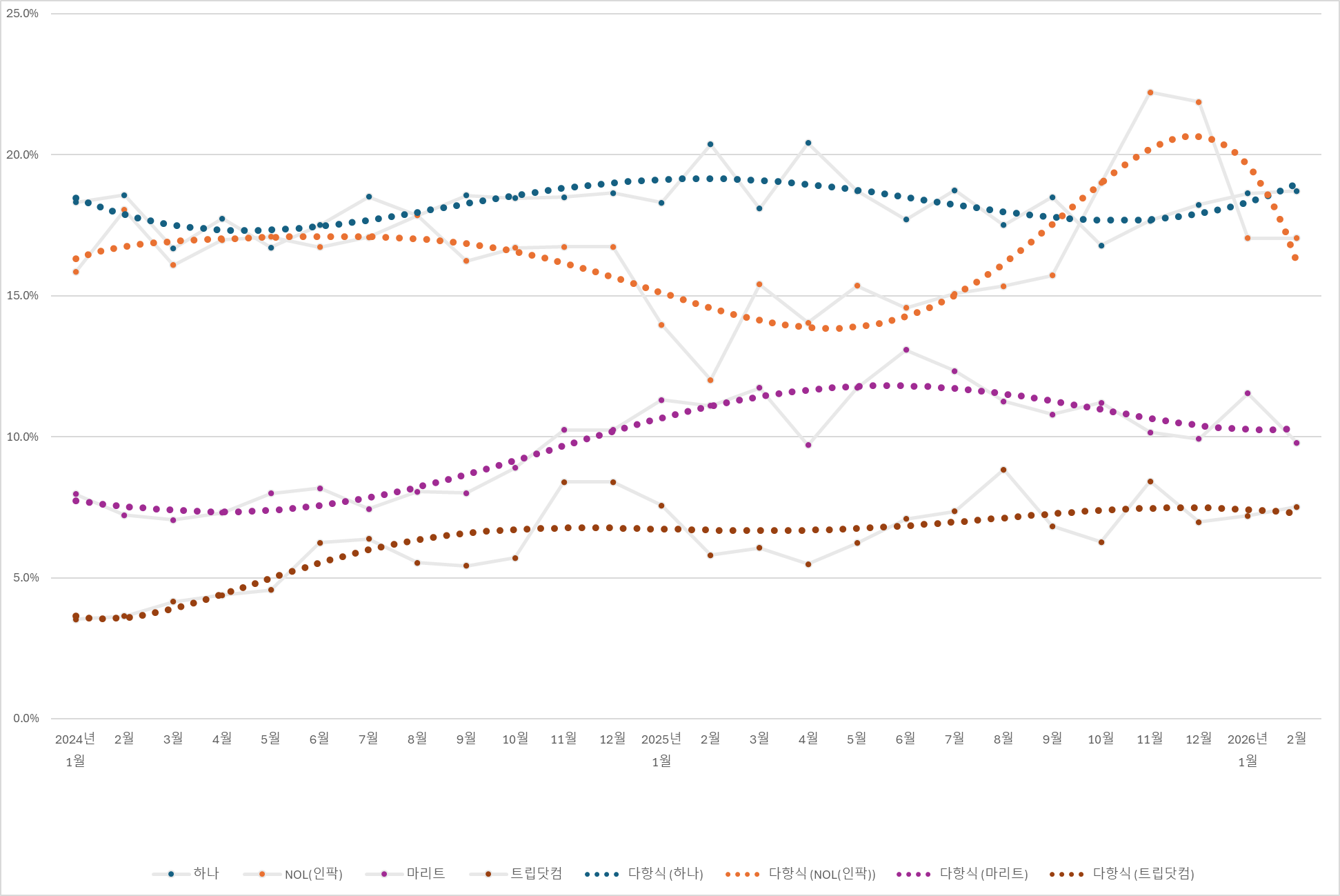 이달의 1위는 하나투어가 차지했습니다. 지난달에 이어 꾸준한 MS를 가져가는 것은 하나투어가 가진 큰 힘이죠. NOL은 거의 지난달과 거의 유사한 성적, 꽤 큰 하락폭을 보인 마리트가 보입니다. MS로 봐서 큰 변동이 없어 보이지만 마리트는 지난달과 비교하면 정말 큰폭의 하락입니다. 하지만 8%의 MS에서 출발한 2024년 1월부터 현재의 12%대의 성적은 정말 대단한 성장입니다. 25년 6월에는 13%를 기록하기도 했네요.
