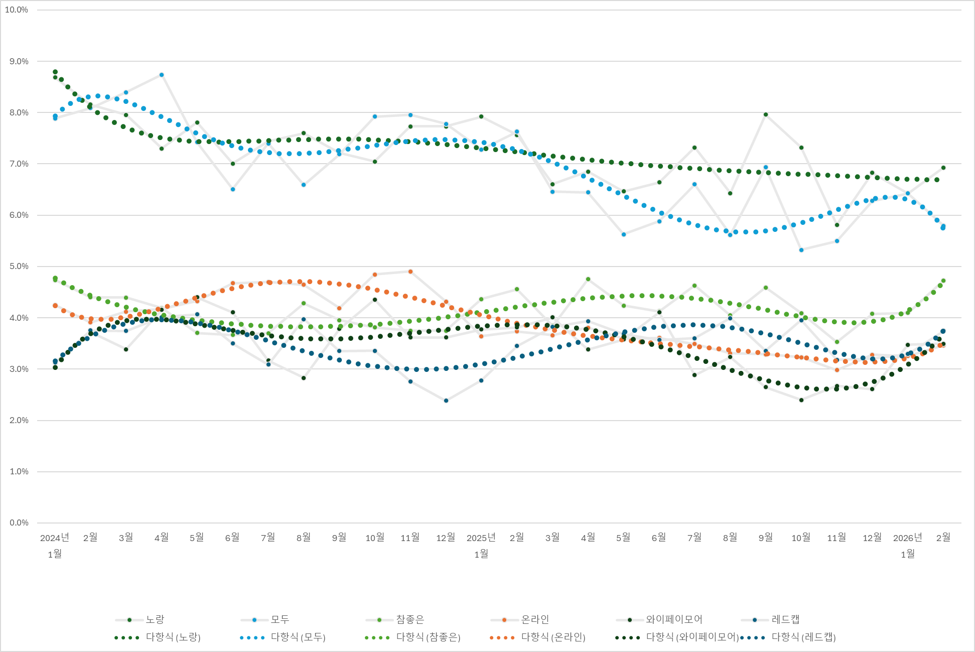 모두투어의 특별한 하락세, 참좋은여행의 두드러진 성장세만 보실게 아니라 사실상 꾸준히 하락하고 있는 노랑풍선의 추세도 보셔야 합니다. 살짝 반등한 2월이지만 실질적으로 크게 성장한 것도 아니고 "끓는 물 속의 개구리"가 되고 있는 노랑풍선과 모두투어입니다.