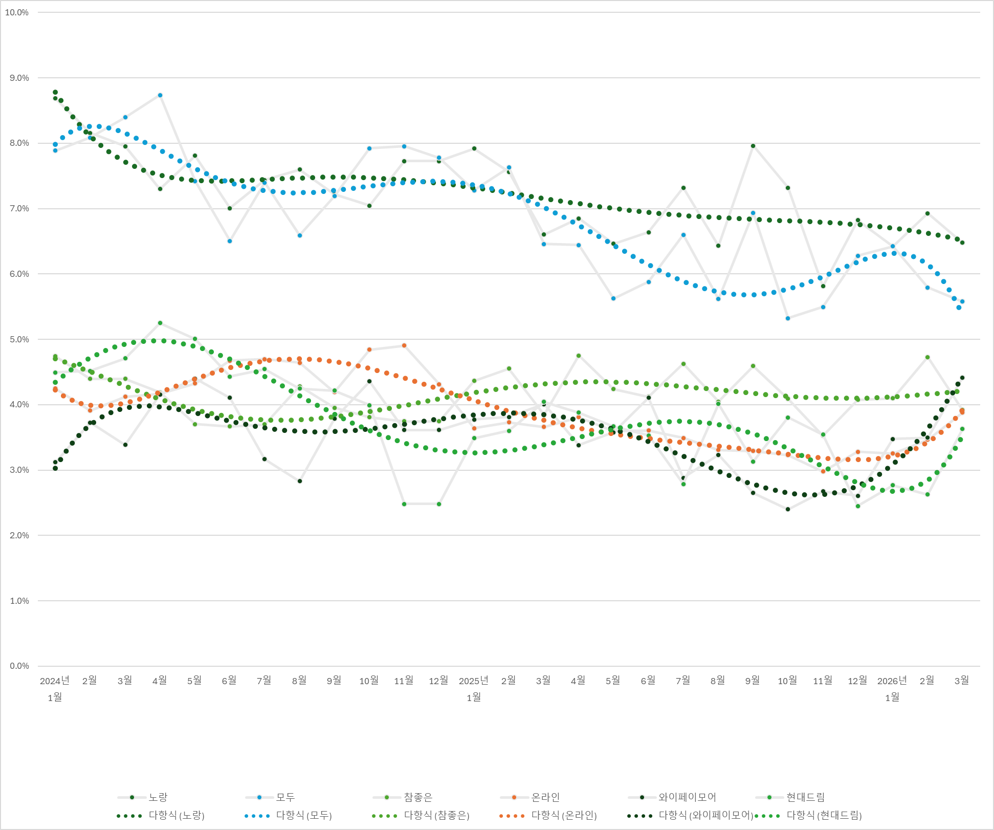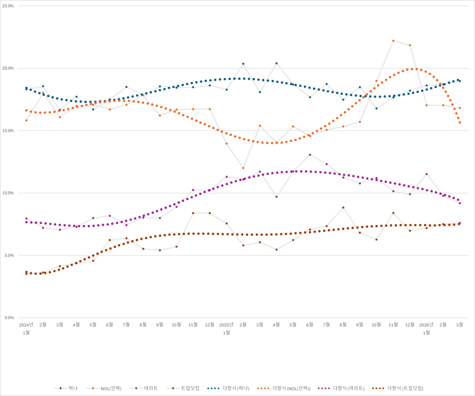 꾸준한 MS를 가져가는 것이 하나투어가 가진 큰 힘이긴 합니다. NOL은 거의 지난달과 거의 유사한 성적, 약간 하락한 마리트가 보입니다. 추세선은 NOL의 하락이 커 보이지만 실제로는 그리 큰 수치가 아닙니다. 지난해 눈에 띄는 큰 상승이 있었기에 하락으로 표시될 뿐입니다. MS이기 때문에 적어 보이지만 하나투어와 NOL의 3월 선발권은 정말 대단한 성적입니다.