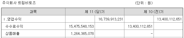 트립비토즈의 이번 감사보고서에서 가장 재미난 부분이라 할 수 있겠습니다. 수수료 수익 154억원으로 약 20억원 증가한 것 외에 "상품매출" 항목이 신설되었고 12.6억원이 표기되어 있습니다.