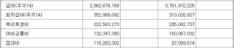 또 다른 큰 변화로는 금여 총액의 감소가 있습니다. 37.6억 수준의 급여가 28.6억원으로 줄어들었습니다. 잘 아시겠지만 지급된 급여가 줄었다는 것은 자발적 퇴사가 있었든지 구조조정을 통한 감원이 발생한 이후 추가로 채용을 진행하지 않았다고 봐야 할 것입니다. 비례해서 복리후생비도 줄어 들었지만 하드블럭 운영을 위한 영업활동의 영향으로 접대비가 살짝 늘어난 부분이 보입니다.