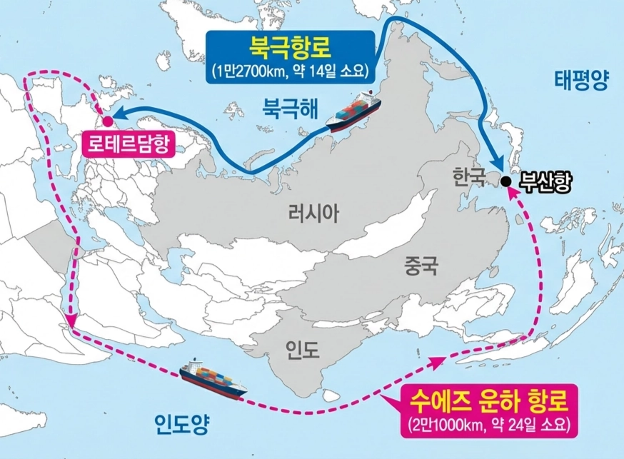 북극항로를 활용할 경우, 이동거리와 시간 모두 다 단축되고, 효율도 높아 질 수 밖에 없다.